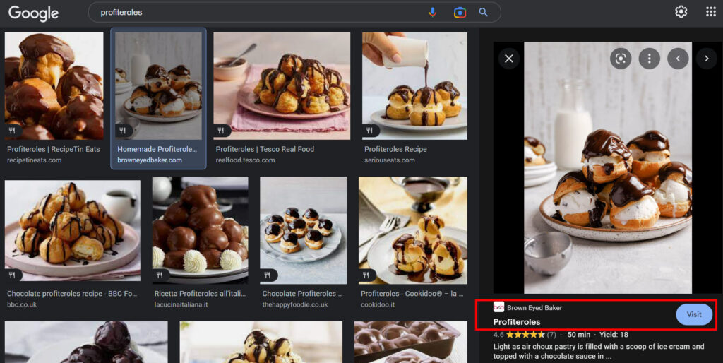 In the screenshot below, after my search for “profiteroles”, I clicked on “more images” and reached this page full of pictures. You can see that Google takes them from a variety of websites that will receive traffic.