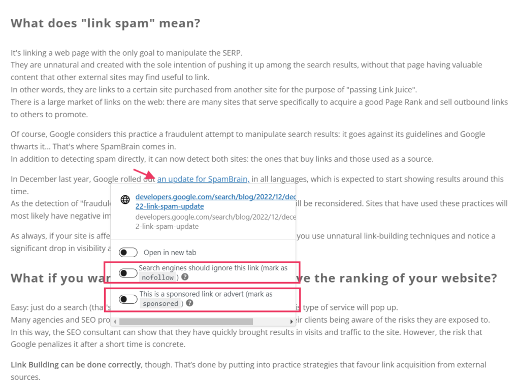CMS platforms usually let you insert it from their publishing interface while you’re writing and want to link something. The option to add a nofollow is usually shown when you add the link; here’s how it’s made on WordPress, just activate the option and you’re done!